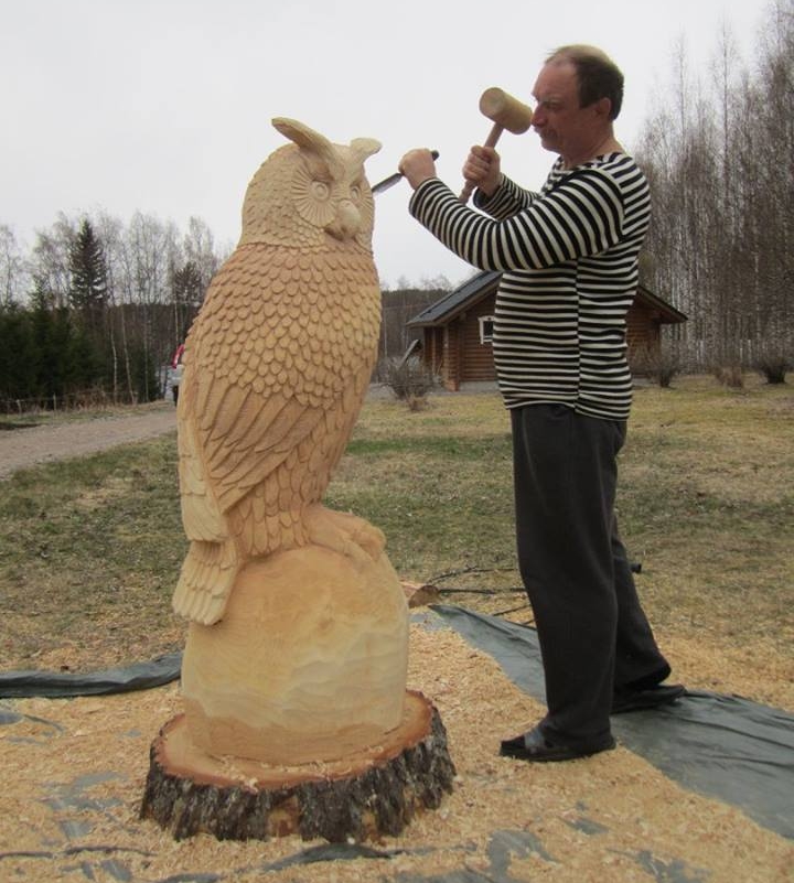 Huge chainsaw night owl that seats on the rock. That big wood carved bird has big amount of feather carving work. Max size of such wooden sculptures really depends on the tree that has been chopped down.