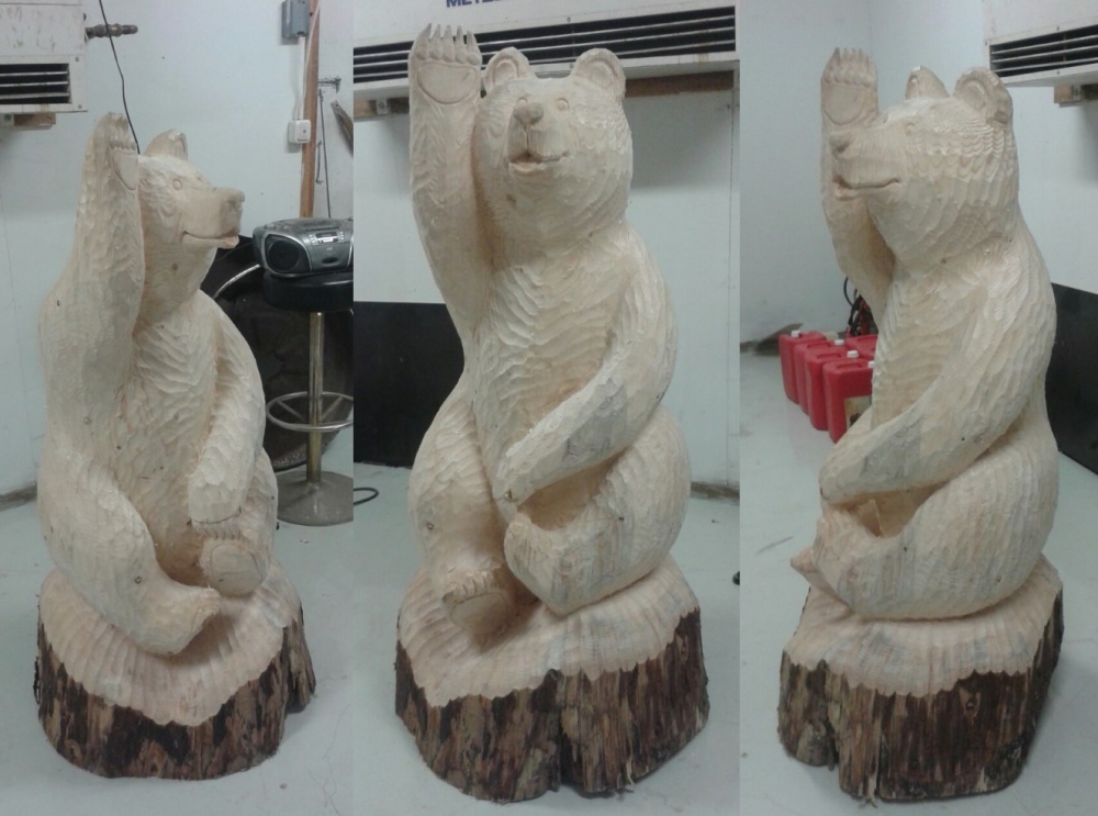 This huge, but cute chainsaw bear greets you and wish you luck. :)